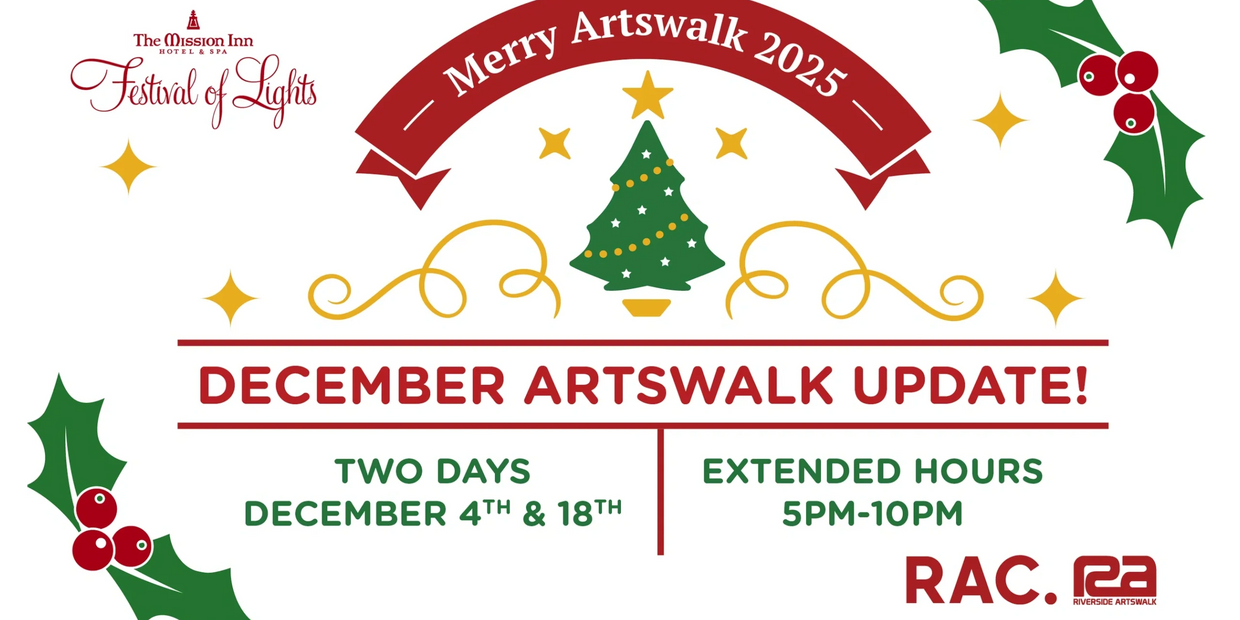 Riverside Merry Artswalk events taking place on Thursday, December 4th and 18th, 2025,