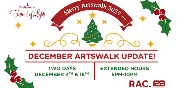 Get ready for TWO special holiday editions of Riverside Artswalk! We’re inviting artists, makers, and organizations to join us for Merry Artswalk on December 4th and 18th, 2025, to showcase and sell their handmade original artworks or share information about their group during the iconic Festival of Lights!